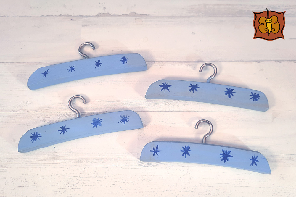 Conjunto de cuatro perchas hechas a mano artesanalmente para guardar ropa de muñecos. Complementos ideales para le conjunto de la habitación del muñeco. Diferentes colores, podéis preguntarnos por los diseños sin compromiso.
